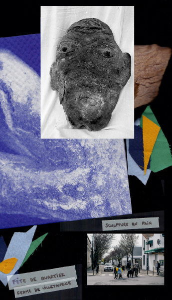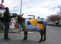 Co-organisation d’une déambulation d’invitation avec les animaux de la ferme parés pour l’occasion et préparation d’une fête où la sculpture de pain, le bonhomme d’hiver sera englouti et des bacs de récupération de pain fabriqués. Sculpture en pain, bannière cousue