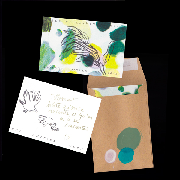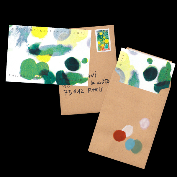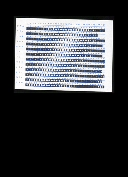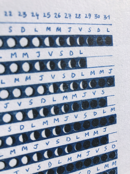Tous les ans, j'envoie une carte de voeux à mon entourage, je la dessine et je l'imprime. Cette année, c'est un calendrier lunaire qui sera reçu dans les boîtes aux lettres pour la nouvelle année 2022. Envoi postal en 60 exemplaires.