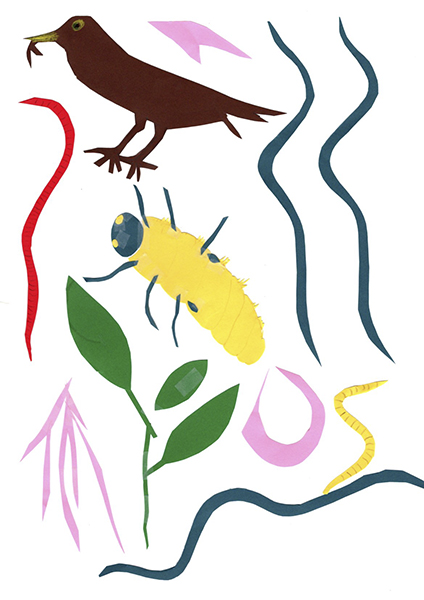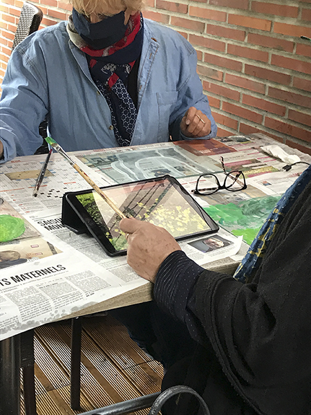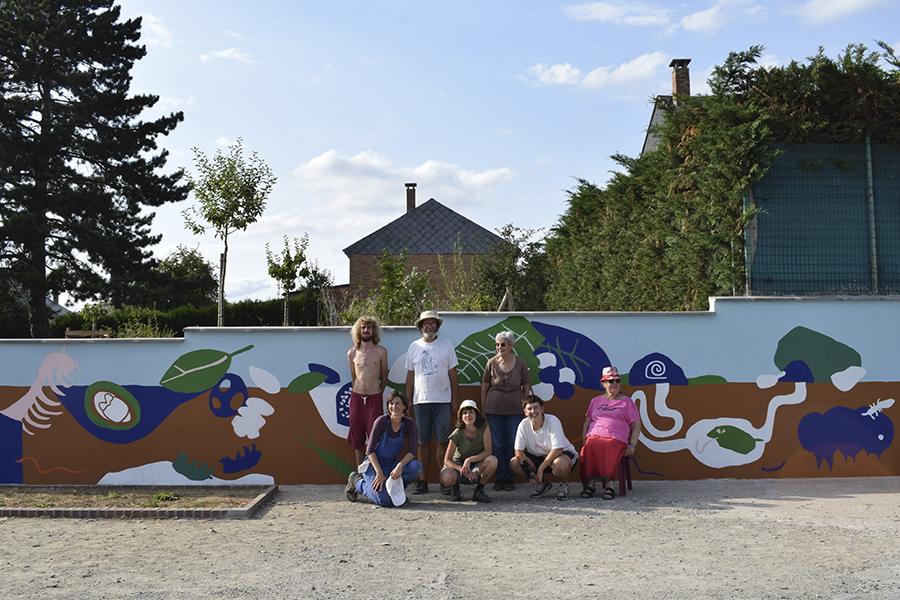 les saprophytes. Composition et peinture avec le comité d'habitants de Douchy-les-mines, les jardiniers et le centre social. Nous travaillons tous ensemble sur la représentations des habitants du sol selon les saisons.