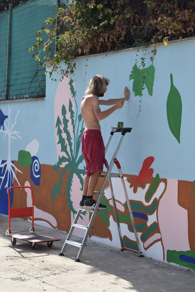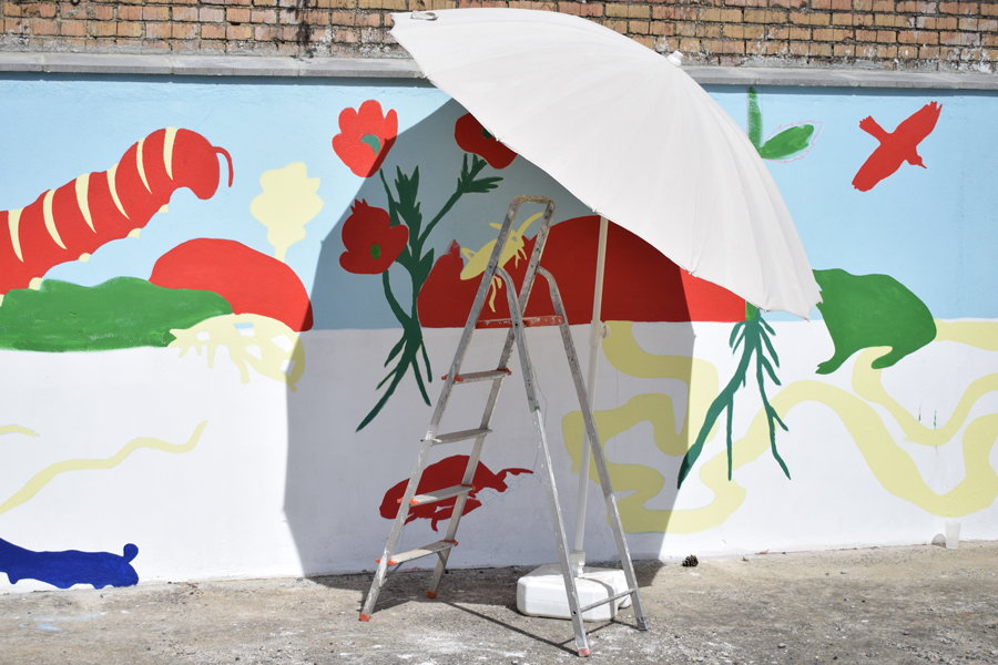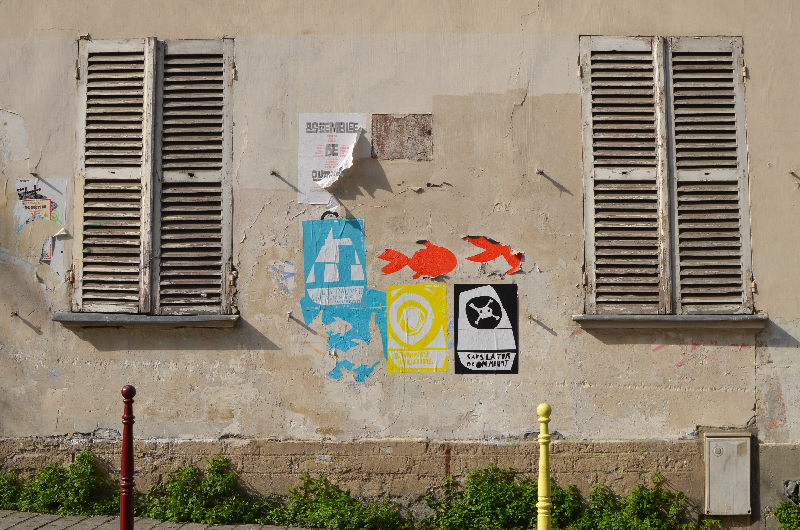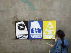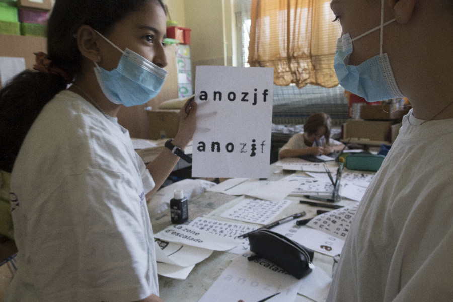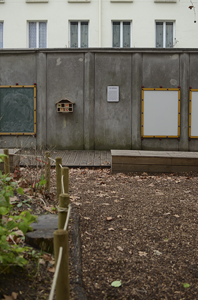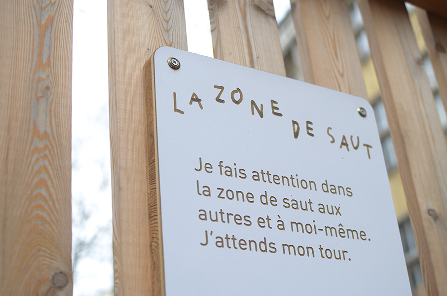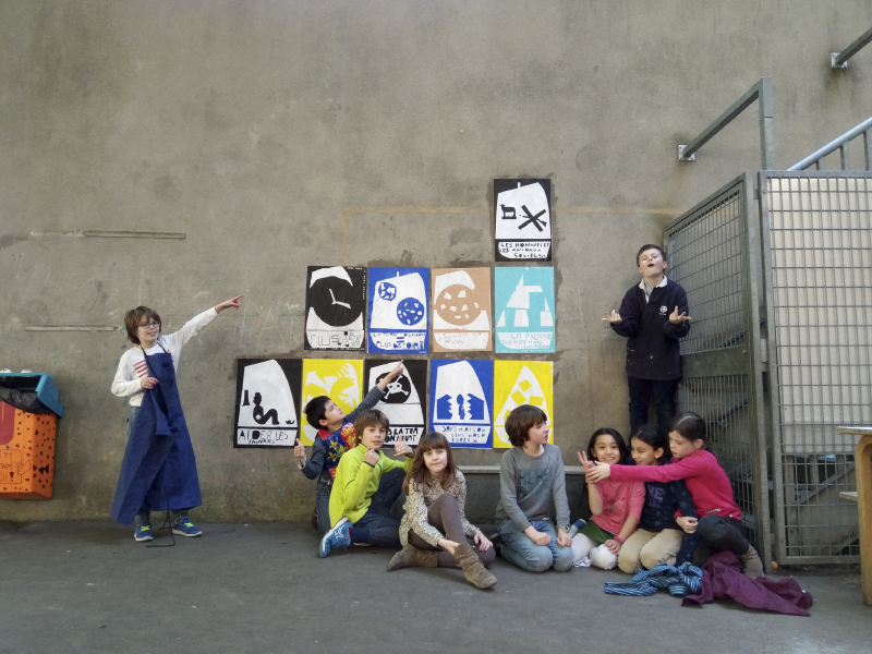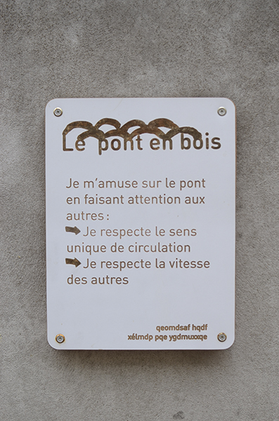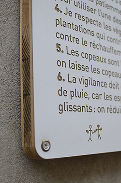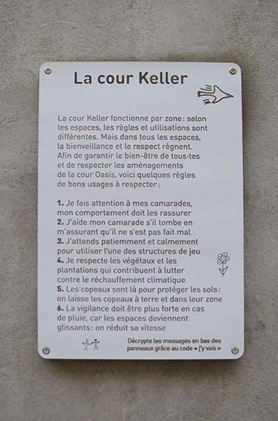 Création de panneaux d’affichage mettant en espace la charte d’utilisation de la cour Keller qui fait partie des cours OASIS qui sont des espaces verts en ville ouverts au public en dehors des horaires scolaires. Travail autour de la typographie, des pictogrammes et du décryptage de codes secrets avec la classe pilote de CP-CM2.