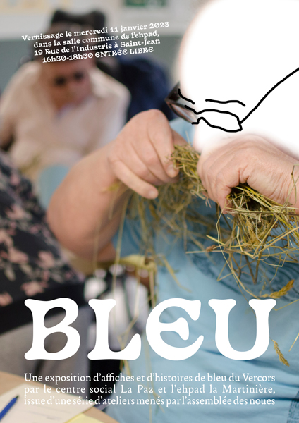 Nous sommes allé rencontrer les producteurs de la ferme de Rocherousse à Saint-Martin-en-Vercors. Nous avons réalisé un reportage photographique et sonore que nous avons partagé en même temps qu'une dégustation et des histoires de bleu du Vercors avec les enfants du centre social La Paz et les résidents de l'Ehpad la Martinière (Saint-Jean-en-Royans). Ces histoires ont fini imprimés et écrites sur des affiches qui ont décorés les murs.