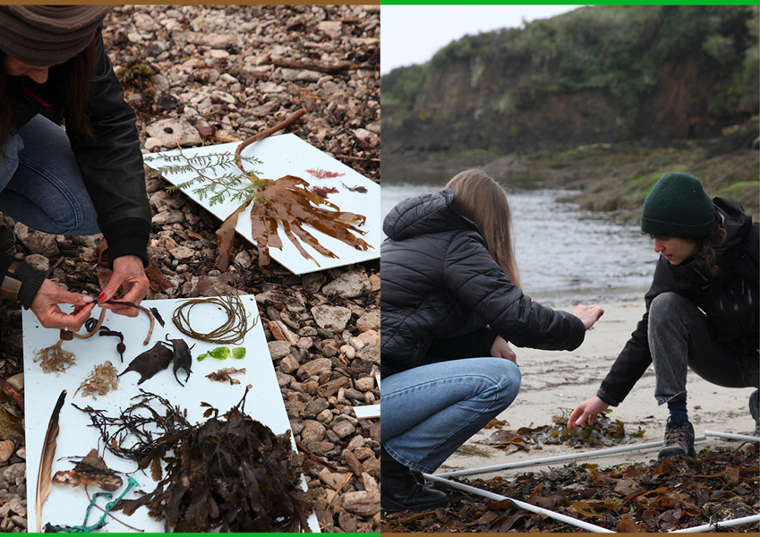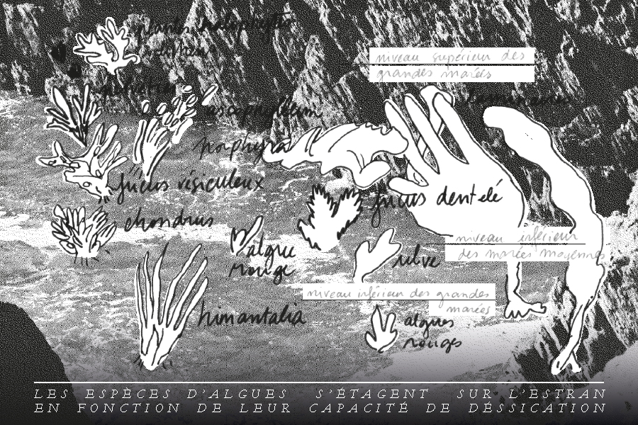 Nos recherches nous plongent entre les algues, à la lisière entre la terre et l’océan. Elles nous mènent à la rencontre de chercheuses en sciences sociales, d’agricultrices, de biologistes, de cidri-, algo- et conchylicultrices, d’artistes peintres et photographes, d’étudiantes, de cuisiniers et de naturalistes.